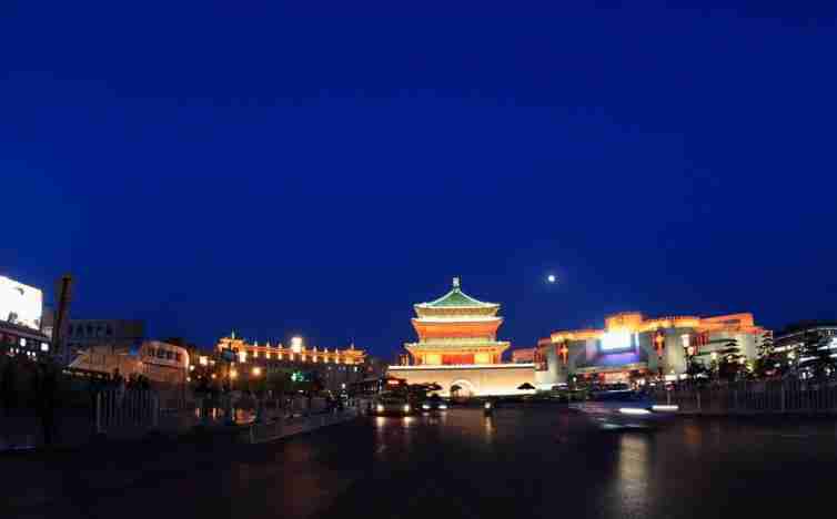 鐘樓。顧名思義,就是樓上有一個巨大的鐘。鐘樓是全國相同類的建筑中的第一名。雖然現在西安鐘樓所用的鐘為仿制景云鐘,但是也是氣勢恢宏。