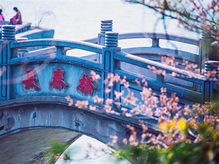 長春橋于1936年建,位于涵萬軒和絳雪軒的一泓水池中,橋的前后筑湖堤同太湖水分隔。橋拱形,仿佛頤和園中的玉帶橋,橋洞映日成渾圓形。湖堤上引種日本櫻花,已有60多年歷史。每年4月,花開如云,淡紅粉白相間,在青山綠水的掩映下,分外妖嬈,稱“長春櫻花”。長春橋向前,有古建筑半露水面,題額“絳雪軒”,與涵萬軒對景。絳雪軒旁為云逗樓,園主為紀念先祖楊度汪而建,上有蔡元培的題額。上坡,有花神廟,建于1931年,中供“花神女夷”像,高髻云裳,姿態端麗。