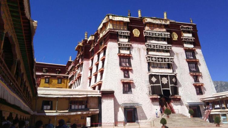 布宮主要由紅宮和白宮組成,中間最高的紅宮是舉行宗教儀式的重要場所;其他白色的建筑為白宮——紅白兩色代表當時藏區政教合一的制度;山腳下還有幾棟黃色的建筑。豐富的顏色不僅讓布宮更加美觀,還蘊含深刻的含義:紅色代表統治三界,白色代表寂靜,黃色則寓意長壽無疆、福源不斷。布宮還有一些附屬建筑,包括山下的雪城和后面的宗角祿康公園等。