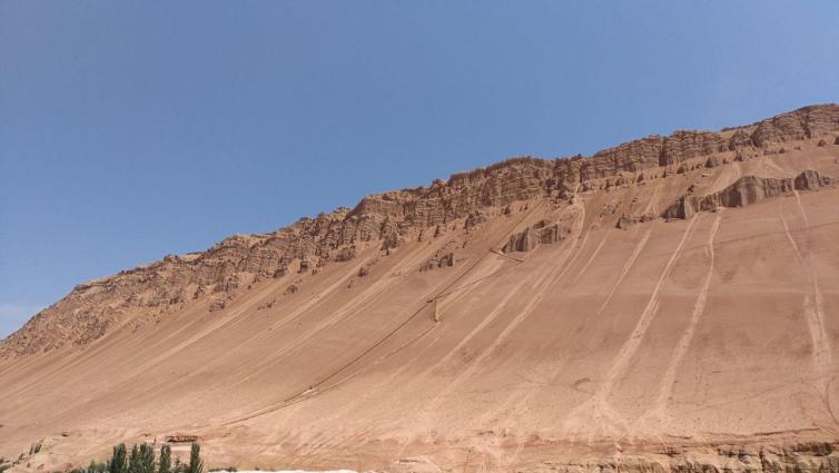 形似一朵蘑菇,四周被豐美碧綠的草原包圍,猶如湛藍大海中的一座金色小島,會發聲。這里幾百年的沙子經歷無數風雨,既沒有向四周擴散,也沒有被綠色植被吞噬,沙子從山頂被攀登沙山的人踩動滑下后會慢慢自動“爬”上去。