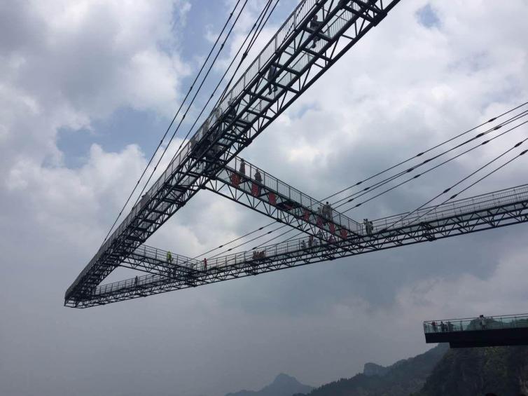 玻璃吊橋,它跟張家界的玻璃橋一樣懸掛在300米高空,但因為不是水平垂直于地面,搖搖欲墜的感覺讓人無時無刻不想念地心引力。這里我要給大家提個醒,此處風大,而且橋面為玻璃材質,所以極易走光,不適合穿裙子游覽。