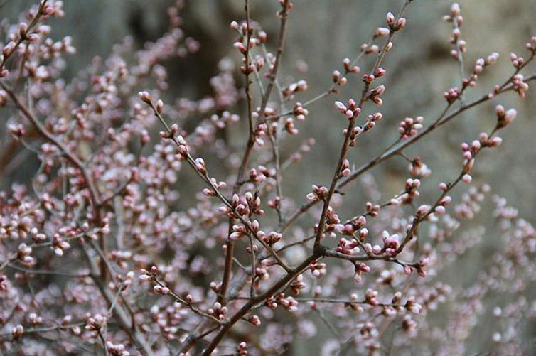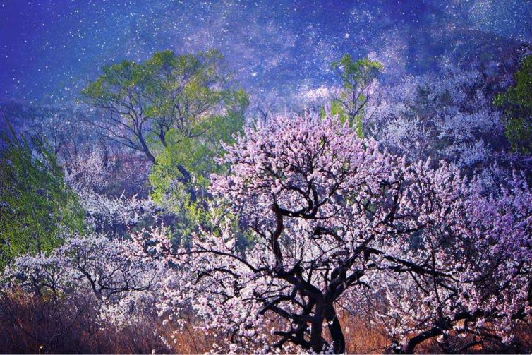 這里生長著一大片杏林,有的相互親密一團一伙,有的個性獨立零散開來,沒有規則的生存在半坡上。春天一到,一樹樹杏花相繼競開,一下子給灰寂了一冬的山野換了春妝。