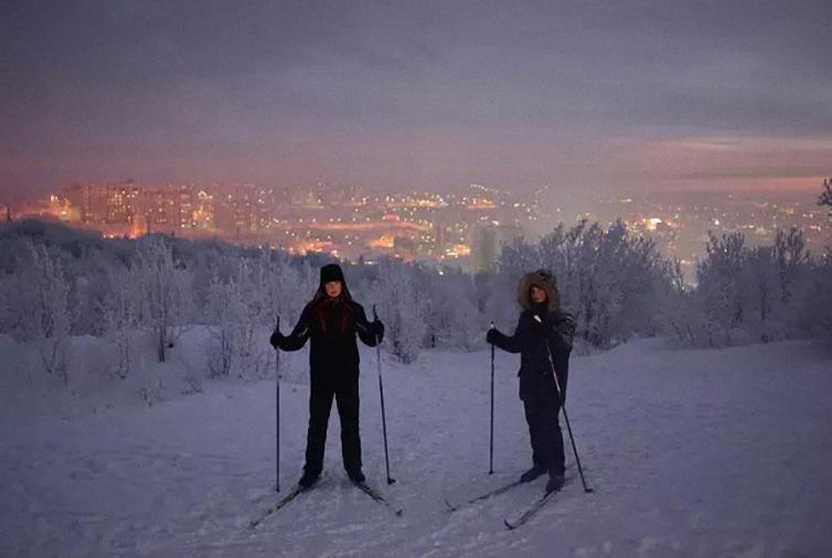 摩爾曼斯克市民在城郊滑雪,身后的城市燈火通明。