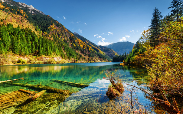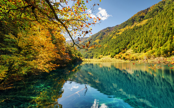九寨溝在四川省,地處四川盆地,氣候適宜,所以孕育了九寨溝如此美麗的景色。