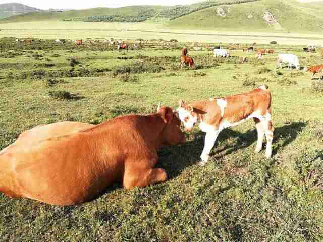 走有走的樂趣,聽著草原歌曲,帶著孩子走走停停,目標就是遠處的牛群。不是在頂牛,是小牛在和媽媽撒嬌呢。