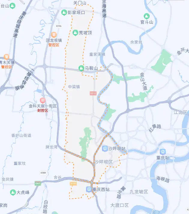 重慶市沙坪壩區:覃家崗街道、渝碚路街道、沙坪壩街道、小龍坎街道、天星橋街道、土灣街道、新橋街道、雙碑街道、石井坡街道、童家橋街道、磁器口街道、山洞街道、井口街道、聯芳街道、歌樂山街道、中梁鎮等