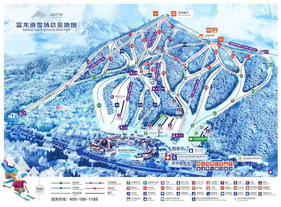 富龍滑雪場秉承“讓滑雪者的眼中‘不再單調’”的文化理念,創立有文化、有品味、有內涵、有活力的世界級全息休閑度假目的地。 建設有滑雪地形公園、DJ廣場、雪人王國、兒童全時托管樂園、雪灘區、觀光大道(后悔道)等特色區域。