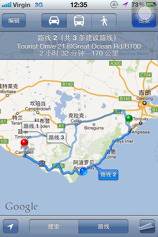走大洋路,建議早上6點半從墨爾本出發(fā),這樣達到地圖上的紅點出,差不多9點半。從墨爾本市區(qū)到紅點處差不多是180多公里,要這么久是因為市區(qū)會堵車還有就是市區(qū)會限速。