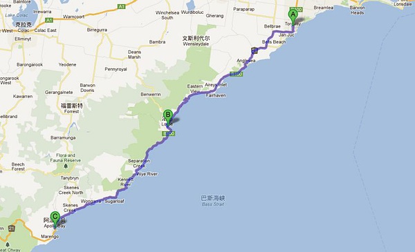 這是我建議好好看海景的一條路,從托基到阿波羅港,既是從A點到C點共92公里,這條路限速80,以前是100.邊走邊看的話,大概要2個半小時。中途可以在B點停下,休息下。B點是LORNE,小鎮(zhèn)很有味道,有條長長通往大海的棧橋,可以在那里拍照或者是看域名釣魚。