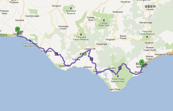 圖中的綠點是大洋路真正的起點,也就是這里有大洋路的一個牌子,可以合影的地方。而紅點則是十二門徒處,看完后可以從紅點處往北回墨爾本。到了紅點處,大洋路公路的美景也結(jié)束了。