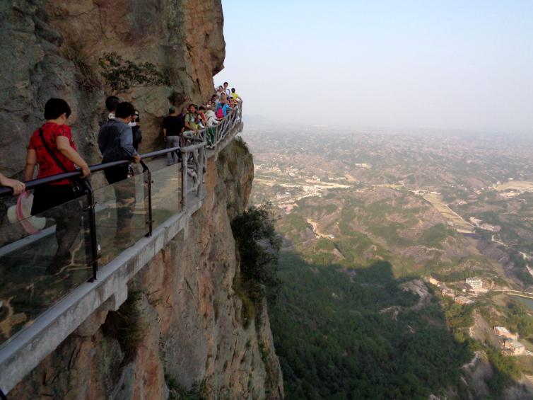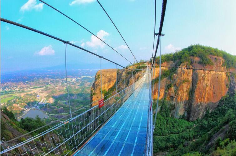 玻璃橋長(zhǎng)約300米,垂直高度達(dá)180米,踏在玻璃橋上,石牛寨峽谷裂隙盡收眼底,行走其上仿如御風(fēng)而行,驚險(xiǎn)無(wú)比,云深霧重之際,如若“云中跳橋”。