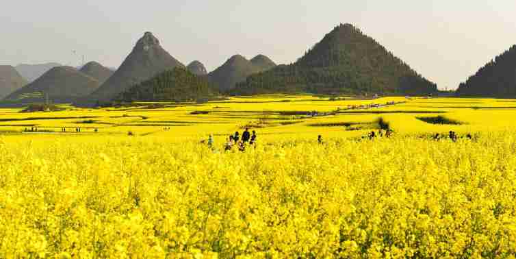 每年2、3月份,油菜花在羅平壩子競相爭放,無不感嘆羅平是“金玉滿堂”之鄉。80萬畝連片的油菜花漾著春日的清香,使得整個的羅平縣城都包裹在了花海之中