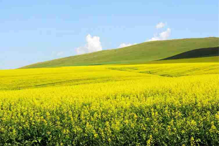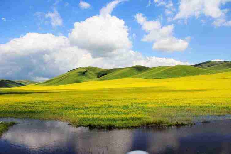 內蒙古扎蘭屯柴河月亮小鎮綽爾河流域,花期一直能持續到8月上旬,是中國盛開最晚的油菜花。綽爾河流域的油菜花,在藍天、白云和青山綠水的映襯下,則更顯其霸氣。從高處俯瞰,眼前都是大塊大塊的黃綠構圖,像是大自然的神手在織錦一般的北方大地上自由揮灑,把金色的彩墨從天潑下,好一副濃墨重彩的油菜花海洋。