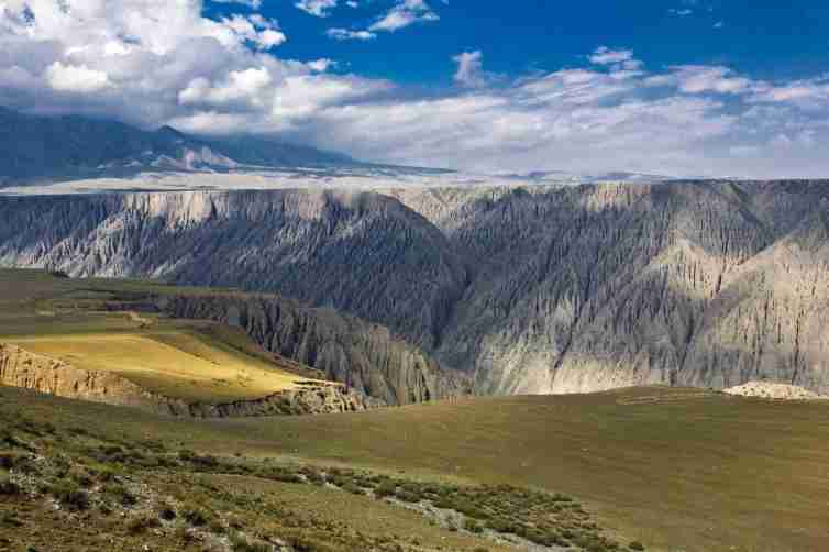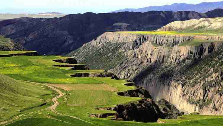 瓊庫什臺溝壑縱橫,頗具陽剛之美。臺地上縱切出無數的溝壑,將平靜的草原勾畫得像大海里掀起的波浪。
