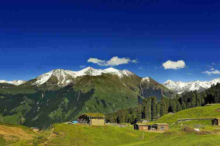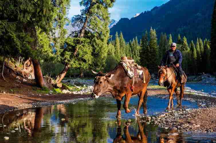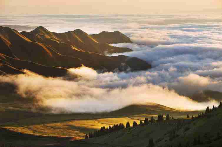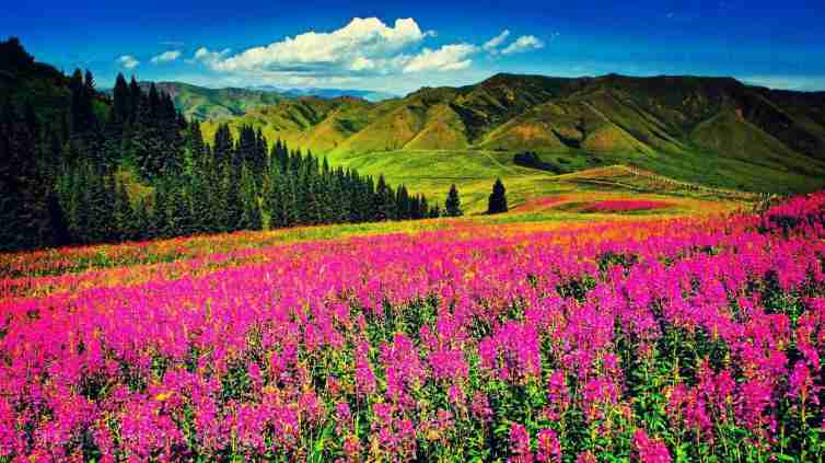 人們可以在這里看到藍天、白云、雪山、松杉林、草原和花海,色彩層次分明、和諧,婉如一幅天然圖畫。瓊庫什臺與喀拉峻大草原隔河相望。