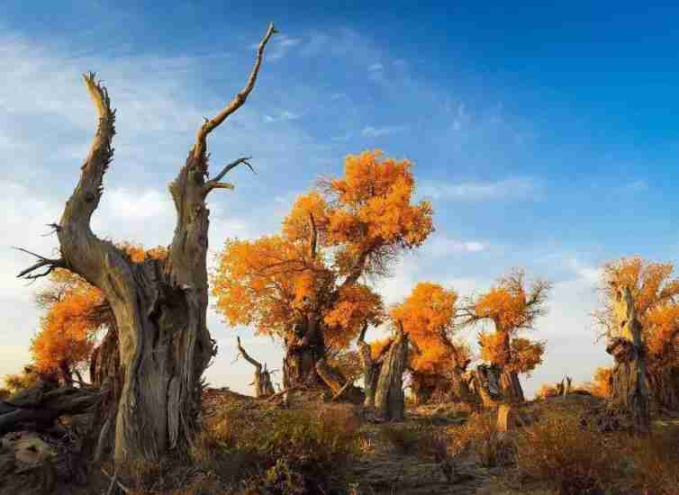 它們生長在沙漠腹地,干涸的沙土地赤裸裸地暴曬在太陽下,惡劣的自然環境下,生長著一片至今已有9000多年胡楊林。
