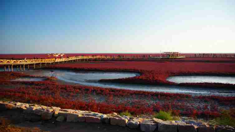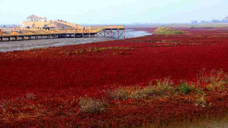 盤錦紅海灘景區是最早開發的,是傳統對外宣傳的“紅海灘”景區。坐落在遼河三角洲的入海口處,是全國乃至全球惟一一處在泥灘上建起的木結構、木樁基礎、承臺式仿古建筑群及純木制旅游景點。走在九曲廊橋上,紅海灘的波瀾壯闊一覽無余。