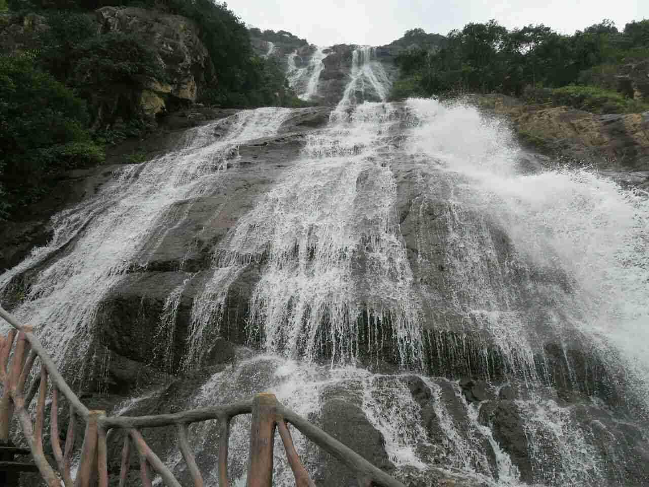 白水寨山山巒層疊,花草蔥蘢,空氣清新,讓人心曠神怡。由于海拔較高,這里氣候涼爽,山中溫度比城市足足低5℃。正值夏季,落差達428.5米的白水仙瀑踏入豐水期,水量大增,景觀壯美。沿古樸厚實的海船木棧道上山,觀瀑平臺巨幅瀑布傾瀉而下,清涼水花撲面而來,負離子含量百倍于城市的清新空氣包圍身心,青山綠水的自然景觀讓人非常放松。