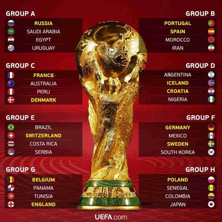 根據(jù)俄羅斯世界杯小組賽分組抽簽儀式在莫斯科的克林姆林宮抽簽的結果,32支球隊被分別抽到了8個小組中,西班牙和葡萄牙、英格蘭和比利時同組,東道主俄羅斯抽到好簽。