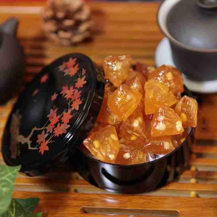 粽子糖是姑蘇特產,可算是世上最美麗的糖了。琥珀色的麥芽糖汁凝成一顆小小的“四角粽”,晶瑩剔透,似有一絲淡淡的粽香入鼻。若是再疏落有致地鑲入幾粒乳白色的松子,誰能說它不是一件精美的藝術品呢?其形狀如間三角粽子形,故取名為粽子糖。粽子糖堅硬透明,有光澤,可以清晰地看見玫瑰花、松子仁均勻地散布在糖體內,猶如美麗的水晶石,食之甘潤,芬芳、可口,有松仁和玫瑰的清香味道。