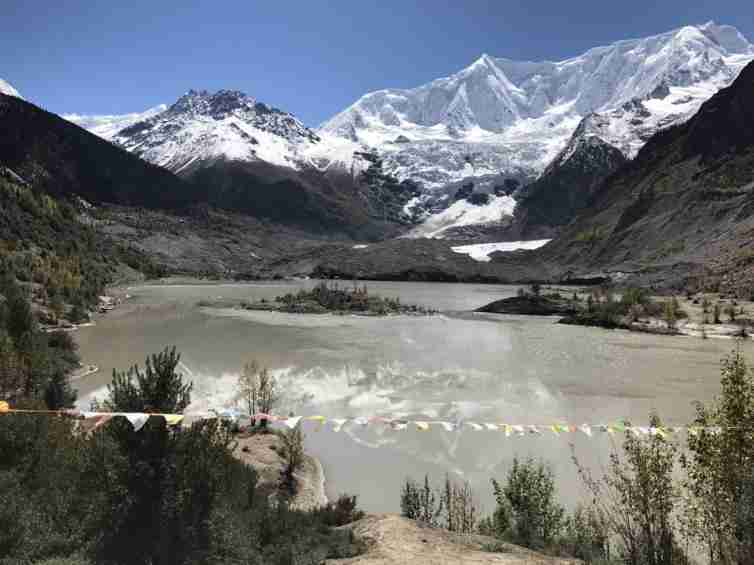 米堆冰川由兩條世界級的冰瀑布匯流而成,每條瀑布高800多米,寬1000多米,兩條瀑布之間還分布著一片原始森林。冰川周圍山花爛漫,林海蔥蘢舞銀蛇。米堆冰川被評為中國最美的冰川之一。