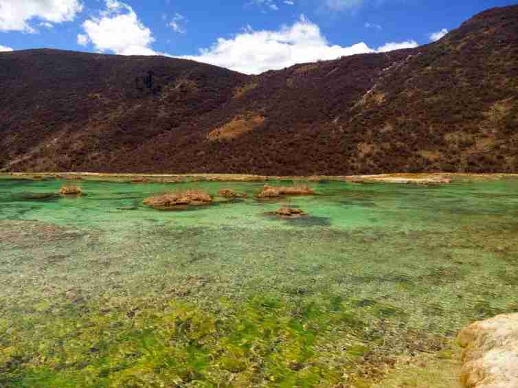 泉華灘,海拔約4000米,屬于高山河谷草甸地貌。泉華灘因一種含有大量化學物質的泉水在地表產生化學沉淀而成,長達900多米,寬100余米,依山而下形成8個泉華階地。每個階地上有十幾個大小不同、形態各異的五色彩池,水深40-70厘米,彩池里水草相依,石花點點,疑為瑤池降臨人間。