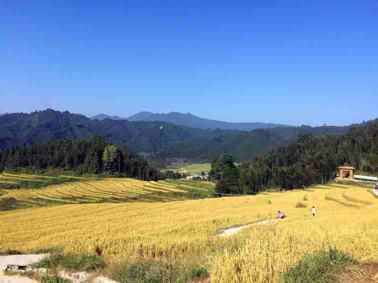 每逢秋收之時,這里一片金黃,稻浪涌金。看到如斯美景,不禁感嘆:賞梯田何須到龍勝,連山的梯田美在不言中。