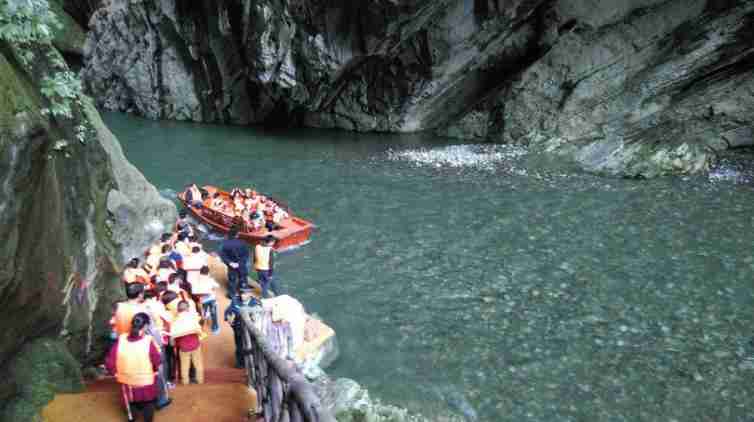 這條暗河就在天生三橋下面,泛舟河上,入眼的不僅有峽谷,還有泉水、瀑布、鐘乳石。