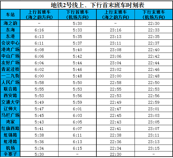 大連地鐵2號線首末班時刻表(2020年最新)