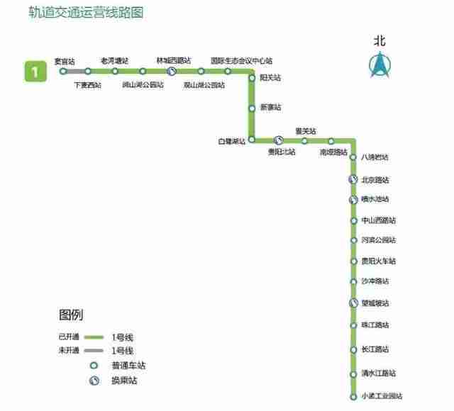 軌道交通1號線起于觀山湖區竇官,經云巖區、南明區,止于貴陽經開區小孟工業園,全長35.196公里,目前貴陽地鐵1號線全線暫時只有竇官站暫未開通,其余站點全部開通運營。