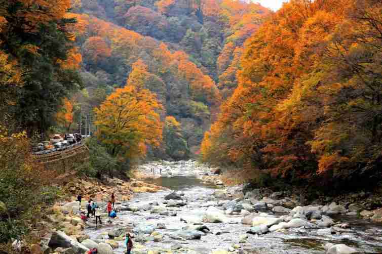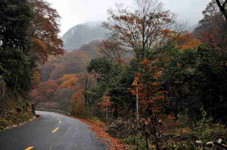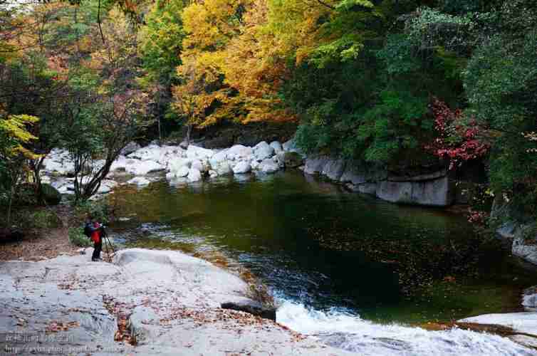 十八月潭是一處比較獨立的景區,核心景區叫做珍珠溝,景區內一條溪流貫穿始終,大小十八座潭水櫛比鱗次,全程木質棧道,總長度約3.5公里,全程走路非常輕松。紅葉節期間到達十八月潭只有一條路可走,就是陳家山——十八月潭,沿途經過九龍臺、九角山、玉印臺,路況良好,水泥路面,盡管有些狹窄,但沿途風景壯美異常。從光霧山鎮到十八月潭大約40公里,在陳家山頂有分路處,這里也是十八月潭的景區大門。