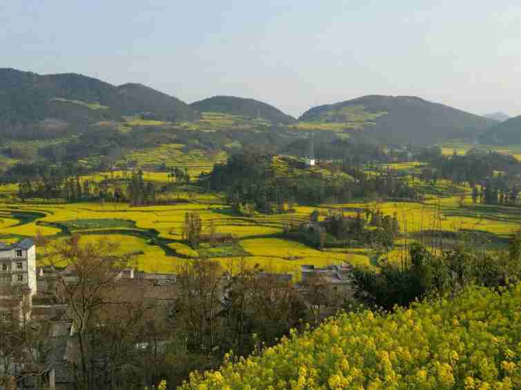 田野間明一塊暗一塊,黃花盛開如此美艷,濃淡相間,層次分明,錯(cuò)落有致。站在高處,滿眼的金黃色,美麗的村莊掩映其中,遠(yuǎn)處的山峰,配成一副極美的畫卷。