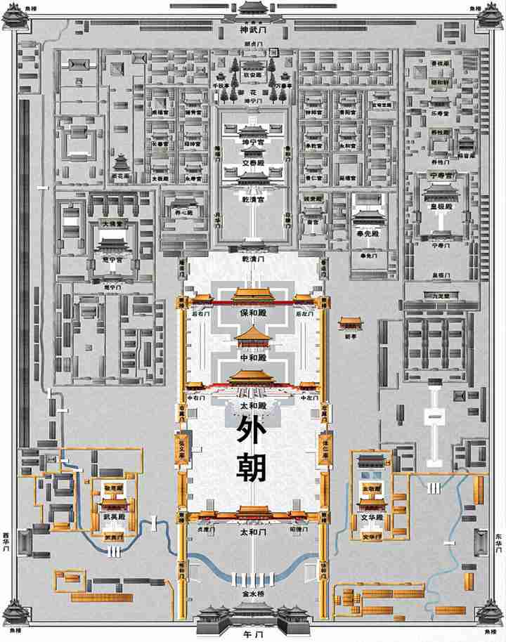 外朝是舉行重大禮儀、群臣朝見(jiàn)天子的區(qū)域,建筑莊嚴(yán)、廣場(chǎng)寬闊。主要包括中軸線上的午門(mén)、太和門(mén)和三大殿——太和殿、中和殿、保和殿,以及東、西兩側(cè)的殿、閣。