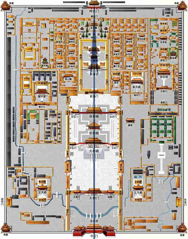 中軸線顧名思義,即是故宮中央的這條線,在此中軸線上分布著故宮內(nèi)最為重要的建筑。包括幾座重要的門(mén)、外朝三大殿、內(nèi)廷后三宮、御花園等。一般初次來(lái)故宮游覽,中軸線上的景點(diǎn)是必觀覽的。