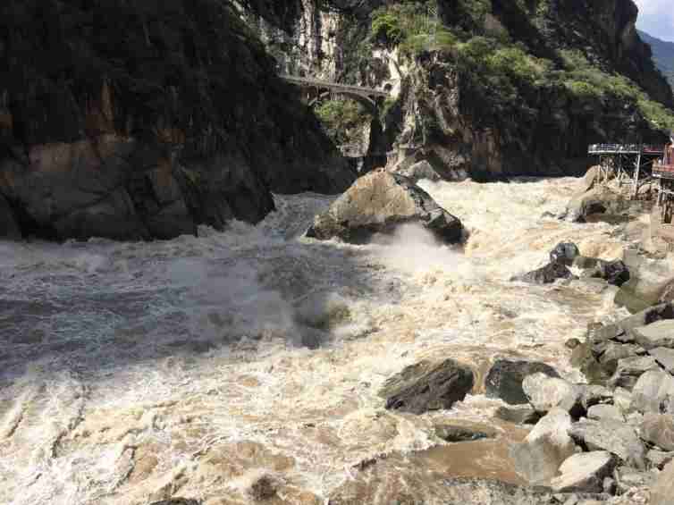 虎跳峽分為三段:上虎跳、中虎跳和下虎跳。上虎跳那里有一個大的觀景平臺,被戲稱為“中老年人觀景活動中心”,因?yàn)槟抢镫y度幾乎為零,而通常驢友走的虎跳峽,是中虎跳和上虎跳。