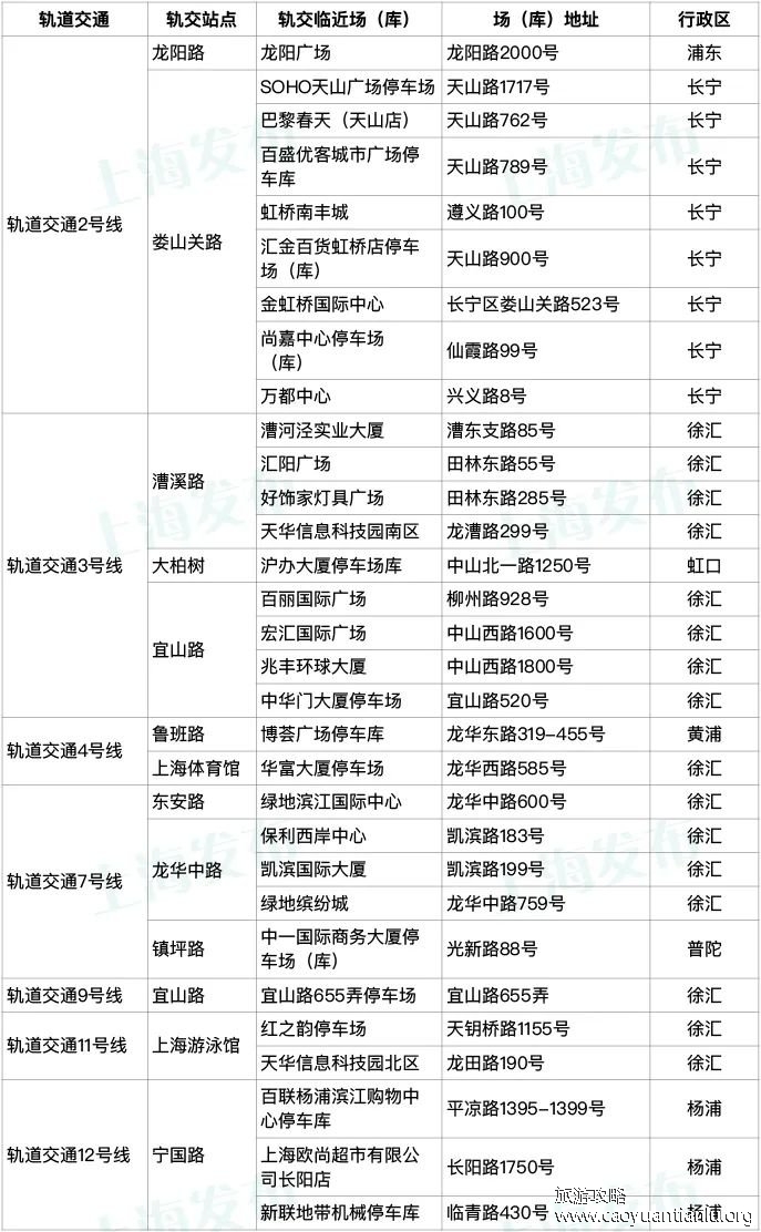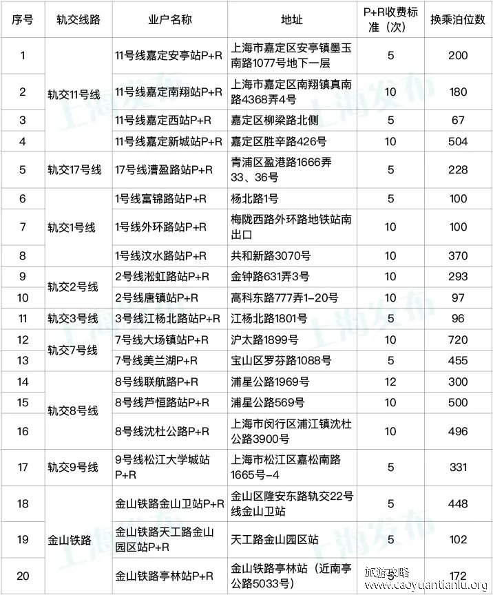 根據(jù)《上海市公共換乘停車場(庫)運營管理規(guī)定》,停車人在上述20個公共換乘停車場(庫)停放車輛期間換乘軌道交通,必須同時符合以下規(guī)定條件,方可享受換乘停車P+R收費標準(次):旅游攻略http://www.936579.cn