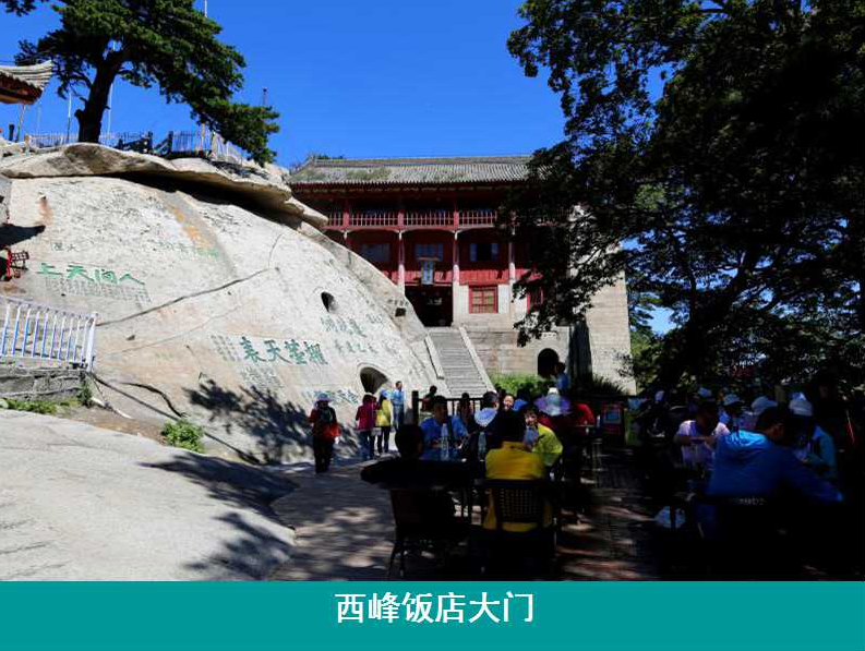 西峰飯店又名翠云宮(住宿包含氣象站),可供游客住宿和就餐,一次性可提供60余人食宿, 西峰也是神話傳說寶蓮燈的發生地,現今還有寶蓮燈、斧劈石、劈山斧等景觀供游客觀賞。入住西峰飯店每天17:00至20:00左右可觀賞華山日落景觀,清晨早起半小時左右,步行便可到達東峰第一時間觀賞日出,景色非常壯觀。