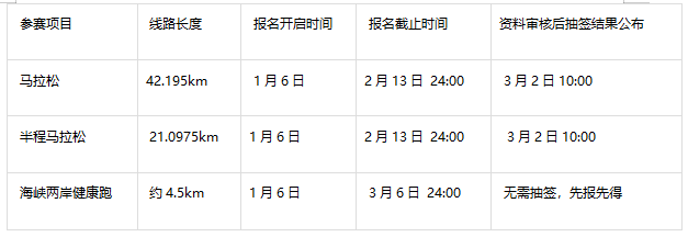 3、組委會將對參賽者報名資料進項審核,審核通過后馬拉松項目及半程馬拉松項目將采取固定額度抽簽方式確認中簽名額,抽簽結(jié)果在官網(wǎng)公示,海峽兩岸健康跑直接獲得參賽資格,名額僅限本人參賽,不可轉(zhuǎn)讓。