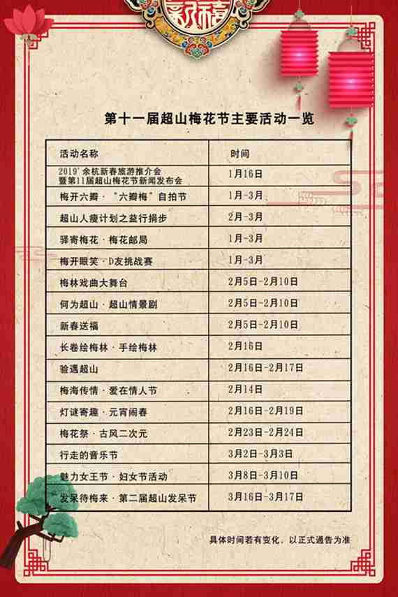 今年梅花節期間將推出超山人瘦計劃之益行捐步、梅開眼笑·D友挑戰賽、梅海傳情·愛在情人節、梅花祭·古風二次元,以及行走的音樂節、魅力女王節與第二屆超山發呆大賽等活動,通過運動、黑科技、交友、動漫、音樂等元素讓超山更好玩、更好看。