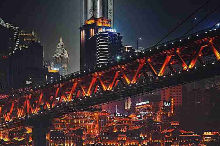 山城夜色是重慶著名一景,我們選擇在晚上向重慶夜色知名的洪崖洞出發。夜晚的洪崖洞光芒璀璨,燈火渲染著墻體,熠熠生輝,好似一座金碧輝煌的宮殿,又好似一座魔幻之都。仿如真實版宮崎駿千與千尋的“湯屋”。
