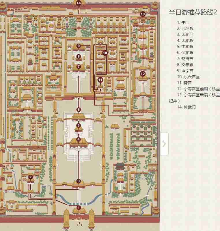 半日游故宮路線一: 1. 午門-->2. 文華殿-->3. 太和門-->4. 太和殿-->5. 中和殿-->6.保和殿-->7. 奉先殿-->8. 乾清宮-->9. 交泰殿-->10. 坤寧宮-->11. 養心殿-->12.西六宮區-->13. 御花園-->14. 神武門。