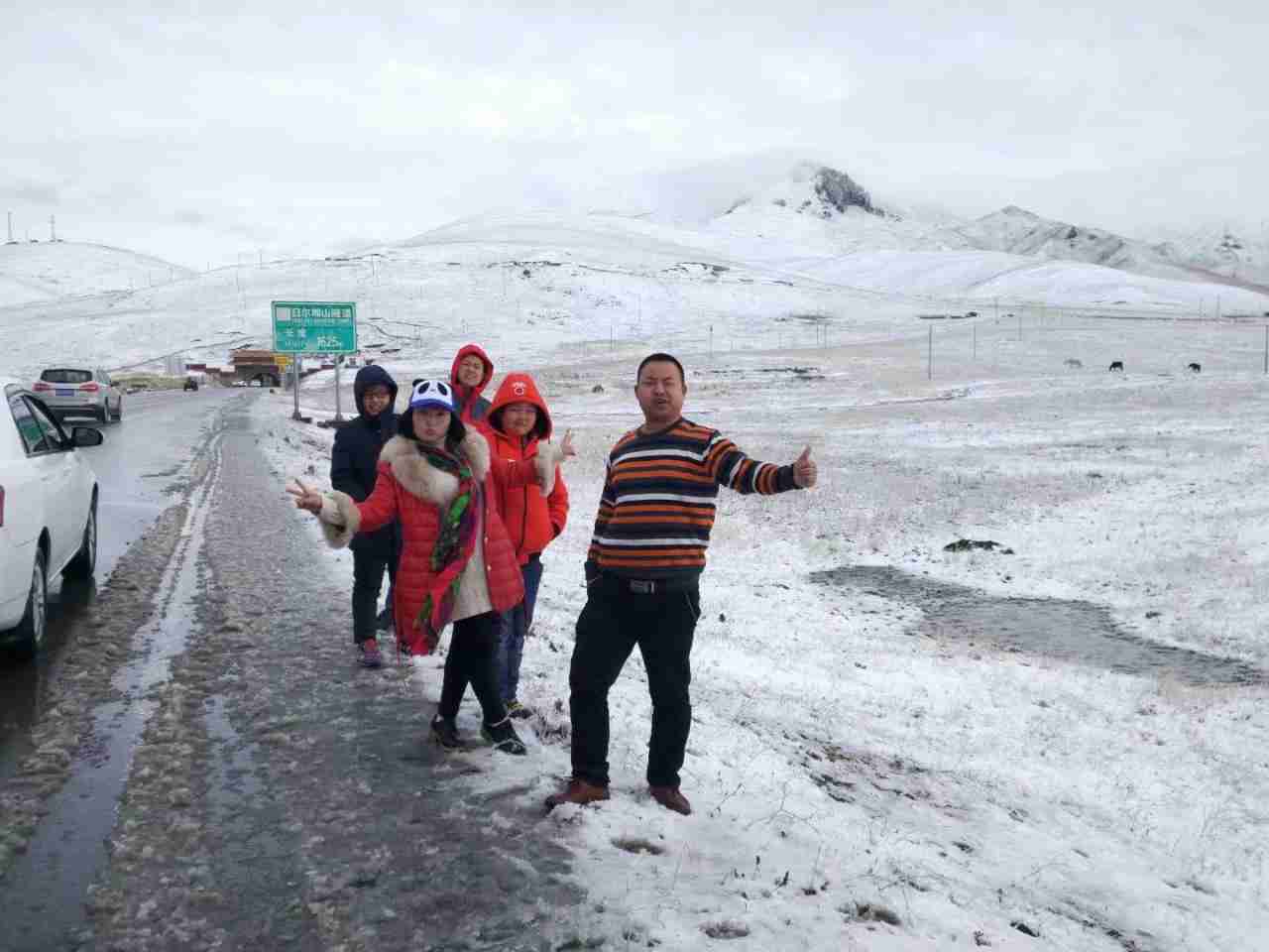 終于在天黑之前兩家人匯合,為了體驗草原風情,我們決定露營,但是為了安全,在一家牧民 旁邊搭起了帳篷,主人給我們提供熱水,并熱情的推薦了羊肉粉湯和手撕牛肉。味道真心不錯,大塊吃肉,小口喝酒,也是一種愜意,只是餐具太不講究,吃到杯盤狼藉才想起沒有拍照。飯吃到了結尾漸漸下起了小雨,空氣開始變得又潮又冷,趕緊收拾后躲進帳篷里,半夜,在帳篷里冷醒了,感覺雨越來越大,哪還顧得著搬進大帳篷的事,直接躲進車里,一直感覺腳不暖和,四周一片漆黑,主人家不時的犬吠聲開始我們難眠的下半夜,兒子和我聊天:媽媽,我們是不是也像是人在囧途?在車里變換了無數個姿勢后盼來了天明,是說一夜覺得冷,車窗上厚厚的一層雪,整個世界一片白茫茫,呵,若爾蓋的初雪啊,就這樣和我們不期而遇了。喜歡看韓劇的我經常在劇里看到:只要在初雪時和心愛的人一起看,就會永遠幸福的在一起,關于初雪的唯美讓我們的心情變得如此興奮,只是主人家的藏獒破壞了我們的好心情,不停的在我們腳邊跳來跳去,天生怕這玩意,我差點嚇哭了,哪還記得拍照的事情,老公有點高反,忙著給他吃藥,吸氧,在小藏獒的追趕中,在大雪紛飛中匆匆收拾離開,去到不到兩公里的縣城找早餐,這么冷的天,怎么得也得吃點暖和的東西吧。車子剛剛停住,店里幾個食客跑出來指著我們的車興奮的問我們從哪兒來,哪里下這么大的雪,而這大雪離他不足二里地,只是城里相對暖和,看不到雪花,真是奇特的天氣,我們再次覺得幸運。