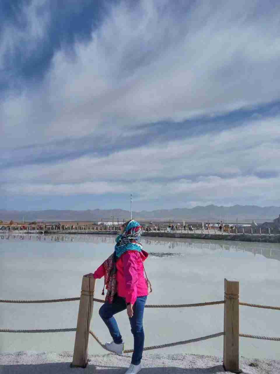 鹽湖不再允許穿鞋套下湖,對于每個來過的人都說一定要去湖里照倒影,那是最美的,湖面上好多人光著腳在湖面尋找自己最美的樣子,用手摸了摸水,冰涼,手變得黏黏的,像是油一樣,很膩,實在沒有光腳下去的勇氣,放棄,我這樣親近而不觸摸也是一種體會吧!藍天白云悠悠,在似夢似幻之間體味別樣的美!