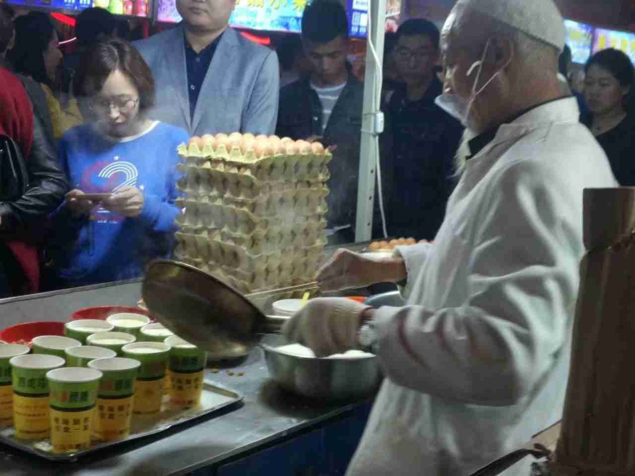 吃飽了不是逛而是睡,估計體重也很對得起自己了。天黑前,妹妹一家會合,放下包就說要尋找吃的,地圖是個好東西,沒費力就找到了蘭州的正寧路夜市小吃一條街,吃了同學特別推薦的羊雜碎,問“度娘”據說制作羊雜碎還講究"三料"、"三湯"、"三味"。的確不負盛名,湯汁香濃,但我不喜歡吃羊肝。但是最讓我記住的卻是舌尖上的中國都上了的牛奶雞蛋醪糟,等自己買了喝了才發現電視上那個馬大爺在淡定的熬著。身后是長長的隊伍,這才是過國慶的節奏,真是好喝,他們用銅鍋煮牛奶,加入醪糟,放入各色干果,葡萄干,喝一口再嘗嘗里面的果脯,真是特別的美味,讓我想想小時候在家用醪糟兌涼開水也覺得特別好吃啊。讓食特撞出這樣的火花,不得不為人們的智慧點贊。擠了一路,吃了一路,感覺自己像打一了場仗出來。