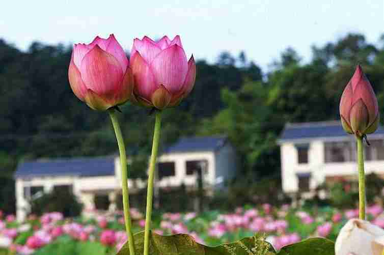 光明村有大片的荷池,花朵映著民居,份外美麗。