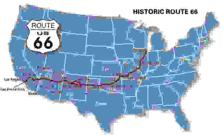 美國66號(hào)公路又被稱為威爾·羅杰斯高速公路或母親之路。這條公路發(fā)源于密西根湖,從芝加哥一路連貫到洛杉磯,途徑伊利諾伊州、密蘇里州、堪薩斯州、奧克拉荷馬州、德克薩斯州、新墨西哥州、亞利桑那州以及加利福利亞州,全長約3939公里,被美國政府認(rèn)定為“國家景觀之路”。