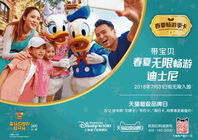 “2018春夏暢游季卡”將于3月12日——“天貓超級(jí)品牌日”起至3月18日,在上海迪士尼度假區(qū)飛豬官方旗艦店獨(dú)家率先發(fā)售,游客在上海迪士尼度假區(qū)飛豬官方旗艦店購(gòu)買全新暢游季卡將享受約八折的早購(gòu)特別優(yōu)惠。