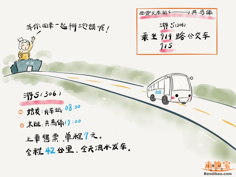 游5(306)路單程7元,全天流水發車,始發:火車站早上8點,末班:兵馬俑站晚上7點。915路/914路單程11元。
