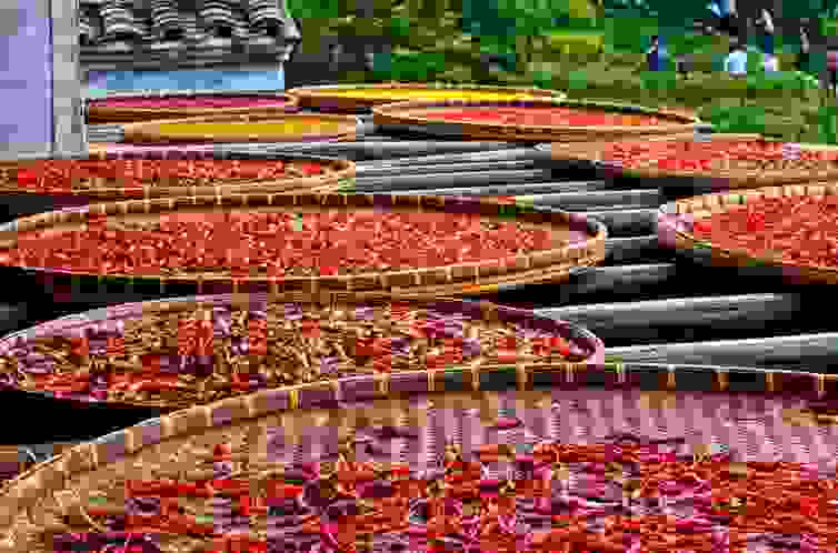 從高處眺望思溪,可以看到村內空地、屋檐下隨處可見的園匾,上面鋪滿了辣椒、花生、玉米、米棗等各種果物。園匾雖多卻錯落有致,果物色彩鮮艷,與遠山、近水、粉墻、黛瓦相映成趣,構成一幅美麗的畫卷,這就是思溪的“曬秋”。“曬秋“也是婺源民間流傳下的一種風俗習慣。在秋天的婺源旅游各大小村落也比較常見。