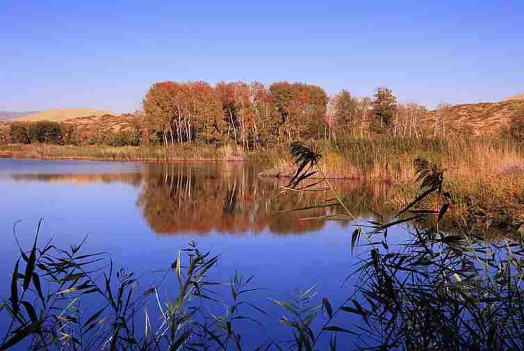 白沙湖南北長約800米,東西寬約600米,形似月牙,是一個被沙丘環繞的沙漠小湖。白沙湖地處沙漠之中,周圍沒有其它湖泊,湖中、岸邊及湖周圍生長著水生植物、闊葉喬木、半干旱灌木等多種反差極大的植被,其成因和生態系統頗受科研工作者關注。湖邊的各類混生林層層疊疊,交相輝映,猶如一個大盆景,人稱 “塞北小江南...